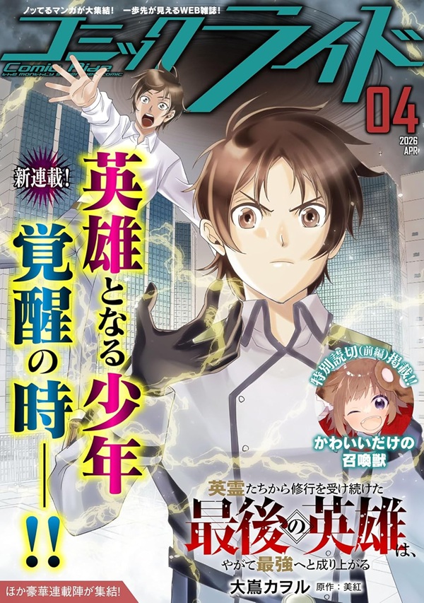 GCN文庫刊『英霊たちから修行を受け続けた最後の英雄は、やがて最強へと成り上がる』のコミカライズ連載が、2026年3月30日配信の電子雑誌「コミックライド118号」よりスタートした。本作はダンジョンが出現し、魔物の脅威に晒されている現代を舞台に、スキルを授かりながらも無能として扱われていた主人公が、死をきっかけに覚醒する成り上がりファンタジー。原作小説は現在第1巻が発売されている。コミカライズの作画は大嶌カヲル氏が担当しており、一挙2話掲載された。無能と蔑まれた青年のダンジョン攻略譚がコミックでもスタートした。