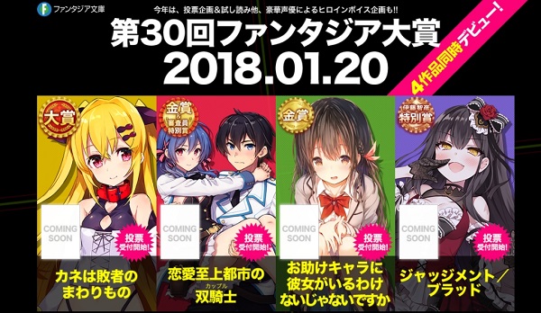 オーディオドラマの制作が決定した『恋愛至上都市の双騎士(カップル)』を含む第30回ファンタジア大賞受賞作4作品は、2018年1月20日に発売となる。発売迫る受賞4作品をスペシャルサイトであらためてチェックしてもらいたい。